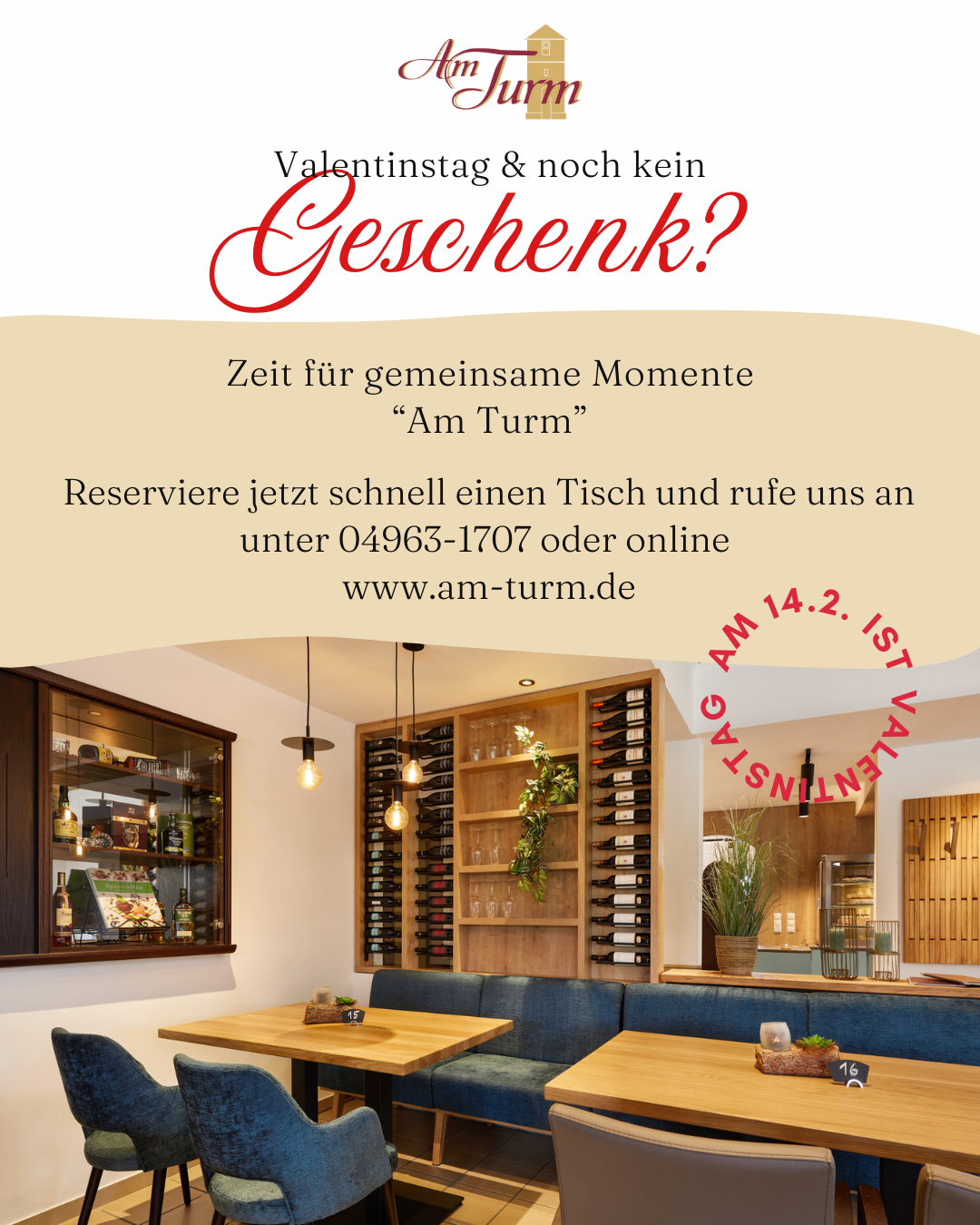 Wir freuen uns darauf, euch am Valentinstag oder auch danach bei uns im Restaurant Am Turm begrüßen zu dürfen.